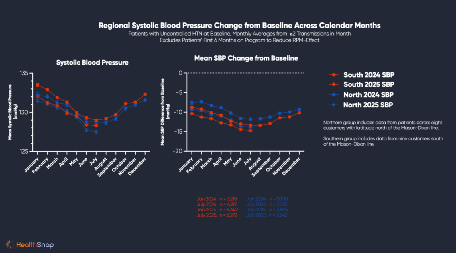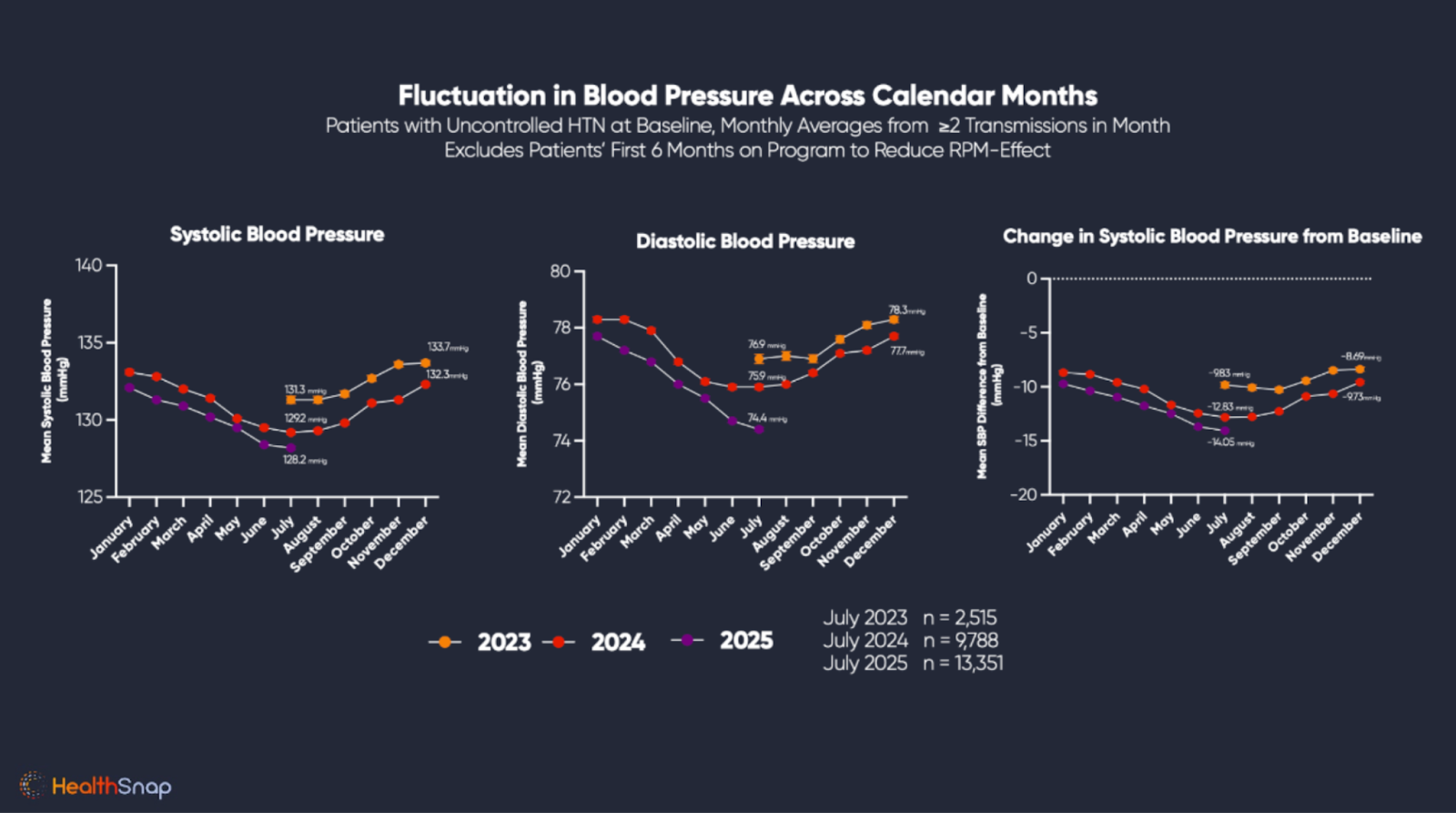 Leveraging one of the largest RPM hypertension datasets in the United States, HealthSnap analyzed over 25 million de-identified blood pressure measurements from 2023 to 2025. The results offer the clearest real-world demonstration to date of how season, geography, age, and time on program shape blood pressure trajectories.