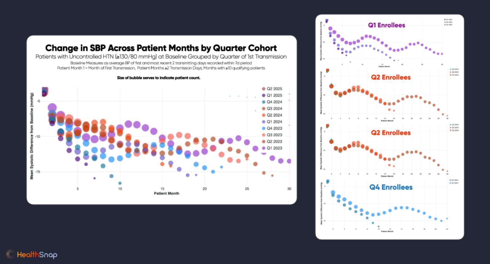 The figure above shows a strikingly consistent pattern across all quarterly enrollment cohorts. Regardless of when patients joined the program, SBP falls rapidly during the first 3–6 months of RPM participation, reflecting accelerated clinical optimization, tightened medication titration, lifestyle adjustments, and enhanced engagement. After this period, SBP stabilizes at approximately 10–15 mmHg below baseline, a durable and clinically meaningful improvement observed across tens of thousands of patients (p < 0.0001).